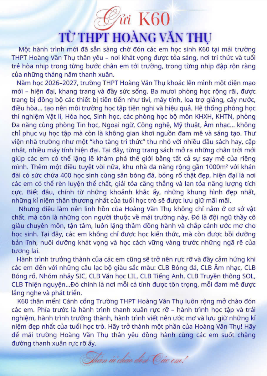 Năm học mới đang mở ra với nhiều cơ hội. Nhà trường sẵn sàng chào đón thế hệ K60 – những học sinh sẽ tiếp tục viết nên hành trình tuổi trẻ tại Hoàng Văn Thụ.