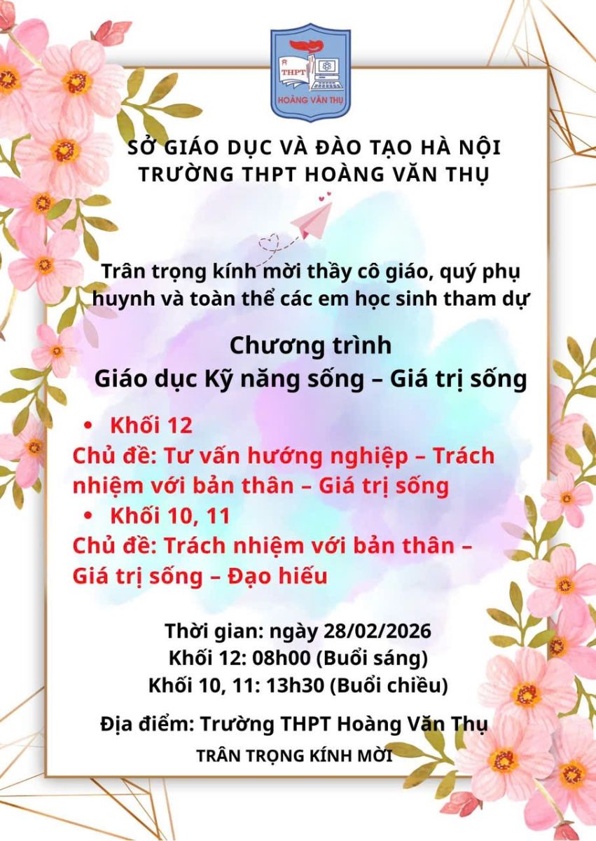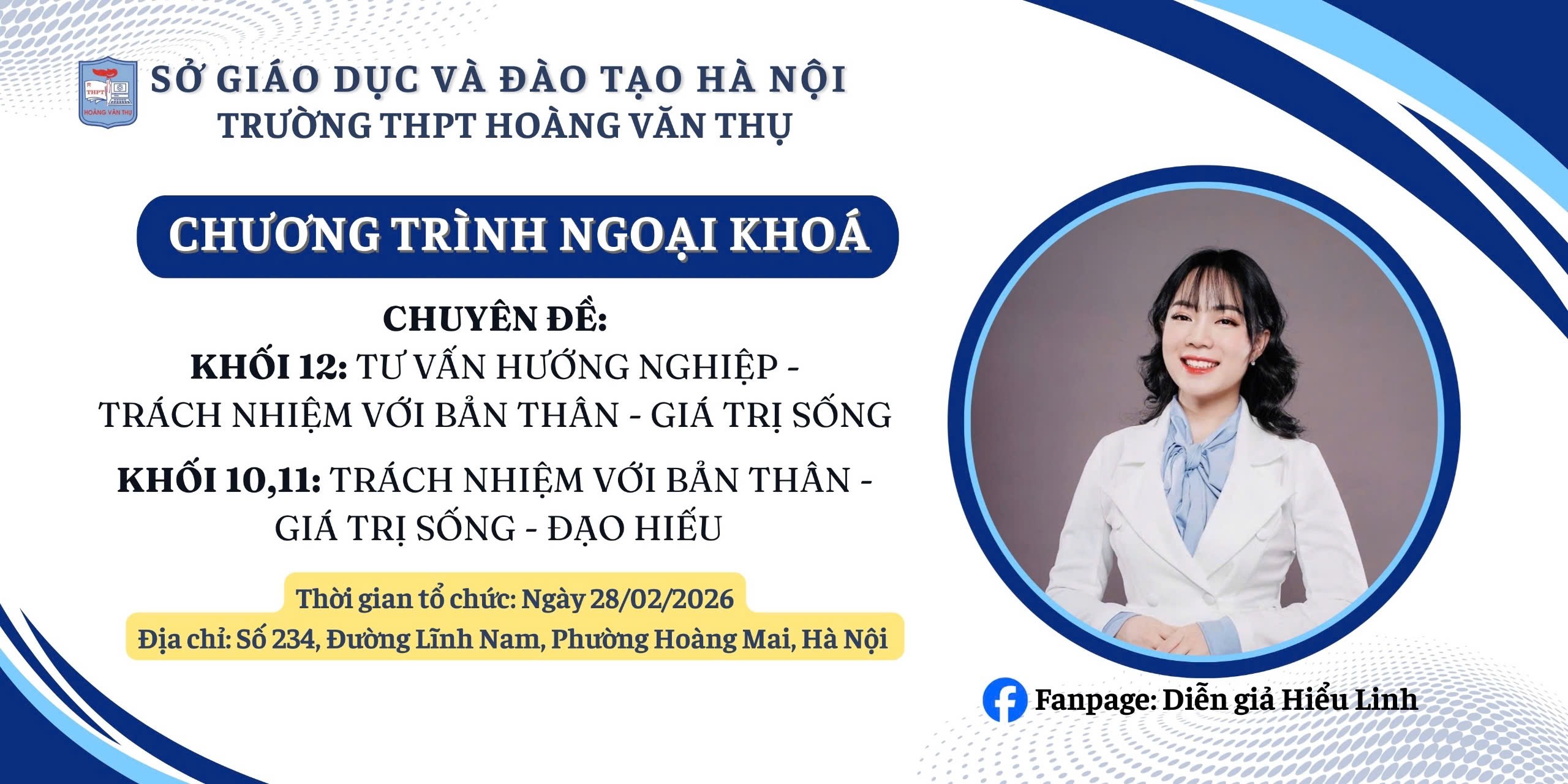 Thực hiện kế hoạch giáo dục toàn diện năm học 2025 – 2026, Trường THPT Hoàng Văn Thụ trân trọng tổ chức chương trình giao lưu – chuyên đề “Kỹ năng sống – Giá trị sống” với sự tham gia của diễn giả Hiểu Linh – chuyên gia truyền cảm hứng và huấn luyện kỹ năng sống được đông đảo học sinh, sinh viên trên cả nước yêu mến.